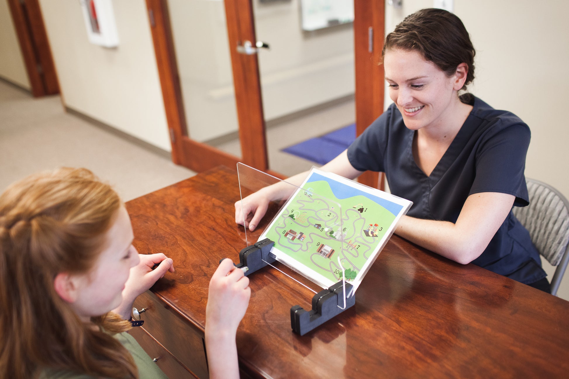 The Z-kit includes a pinpoint flashlight, foam pegboard, pegs of assorted color and height, and two angled mazes (This takes the activity to the next level as patients must try not only to keep the reflection on the road of the maze but also must accurately localize the reflection along the z-axis).